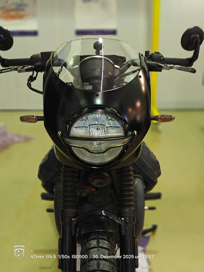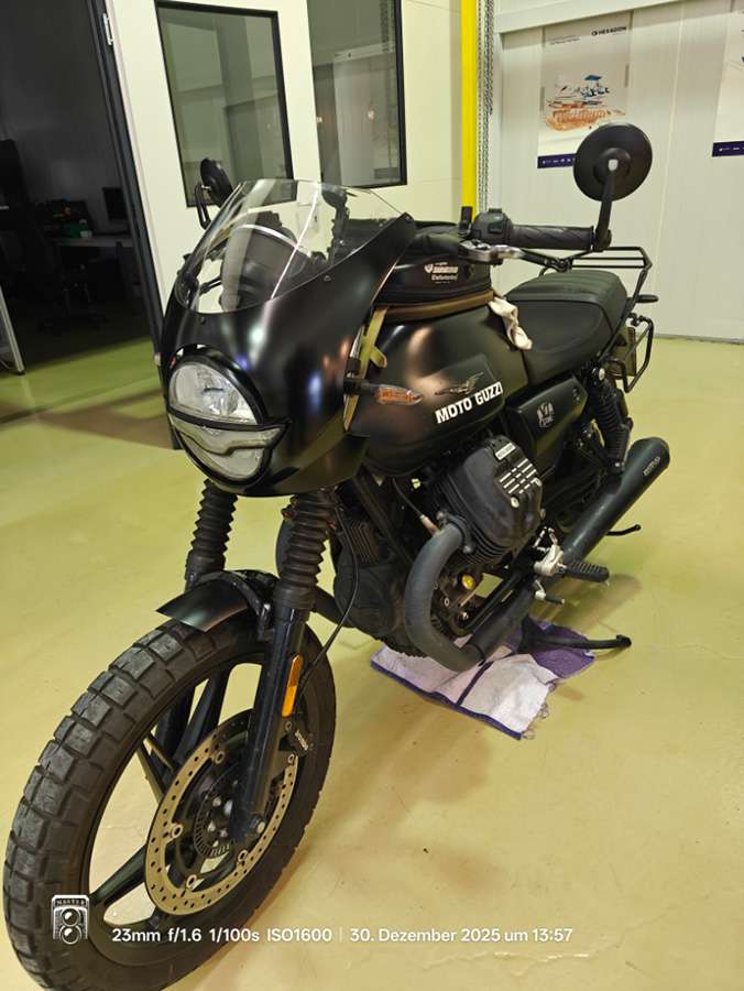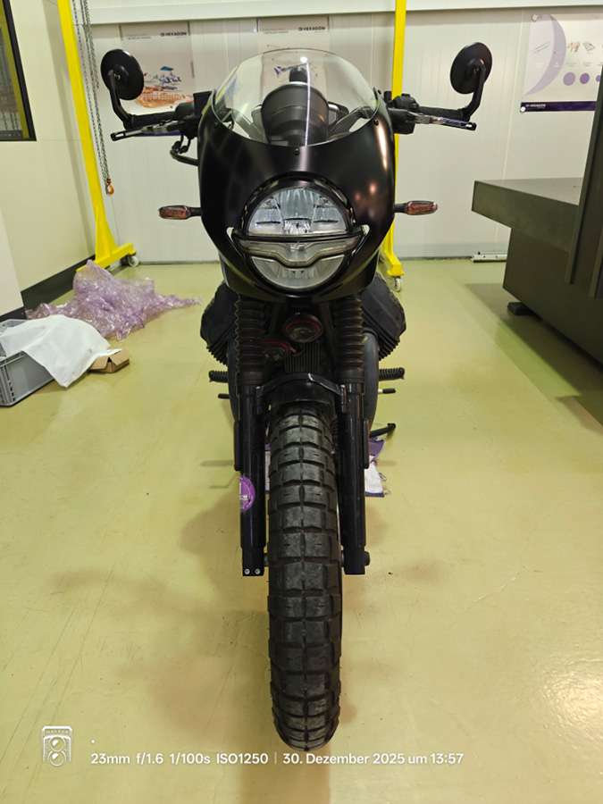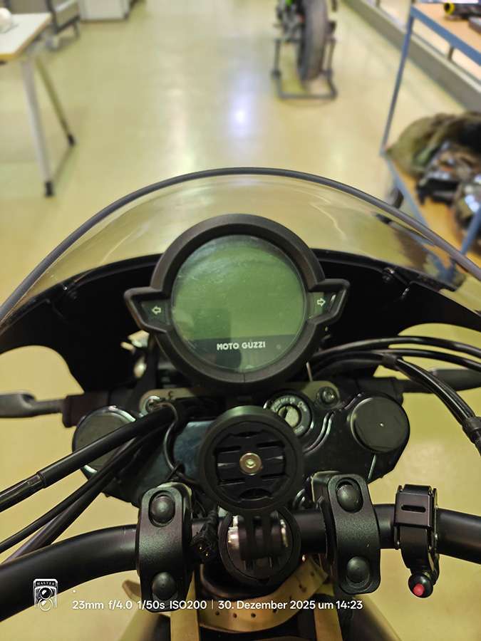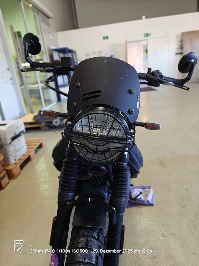 Bei RVRS MOTO in Appignano in Italien habe ich mir bei Mateo den schwarzen Cover-Ring für den Tacho bestellt. Sieht sehr fein aus. Leider lassen sich die kleinen Öhrlein oder Adlerschwingen für die Blinker nicht entfernen. Dem Designer von Moto Guzzi hat dies gefallen, mir weniger. Rund klassisch wäre schöner.