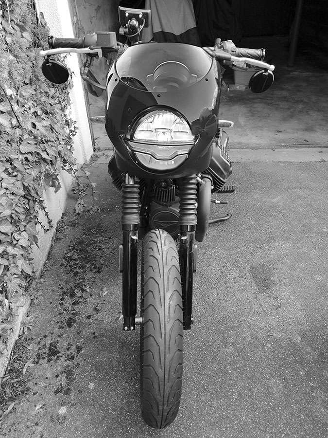 Gesehen hab ich die bei Guzzi Resi an seiner GUZZILLA . Ich würde es natürlich matt Schwarz lassenund evntl. mit der Startnummer 63 versehen.